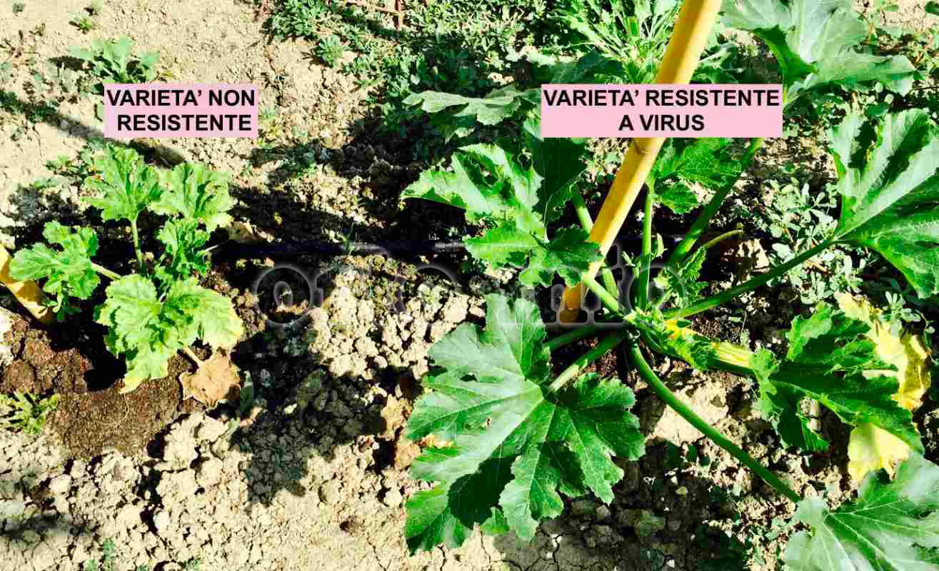 I virus delle cucurbitacee sono il principale fattore limitante per le coltivazioni di zucchini e cetrioli in campo aperto. Per questo le varietà Orto Mio sono scelte tra quelle naturalmente resistenti ai principali virus (nelle specie e tipologie disponibili), che si sono rivelate una vera rivoluzione anche per l’orticoltura professionale. Il valore di questi ibridi resistenti si evidenzia, nel confronto in campo con quelli sensibili nella capacità di produrre anche quando le altre varietà sono compromesse. I virus più diffusi di zucchino e cetriolo (ZYMV, WMV, CMV), vengono trasmessi principalmente dagli afidi. Nelle piante infettate, la produzione può bloccarsi in pochi giorni, con sintomi più o meno evidenti, che possono andare dal mancato sviluppo vegetativo (figura 1), dall’interruzione della produzione (figura 2), a decolorazioni (figura 3) e deformazioni di foglie (figura 4 - figura 5 - figura 6) e frutti (figura 7 - figura 8 - figura 9 - figura 10). La scelta delle varietà Orto Mio resistenti ai principali virus è lo strumento più sicuro ed efficace per prevenire gli attacchi virali. Nella gamma ci sono molte varietà di zucchino resistenti a più virus (e alcune anche a oidio) (controllare le indicazioni sul sito nelle caratteristiche delle singole varietà). Tra i cetrioli Induran F1 e Caman F1 sono res. a virus CMV (e oidio), il nuovo cetriolo Burpless Tasty king top F1, ha resistenza multi virus (disponibile in vasetto e innestato)